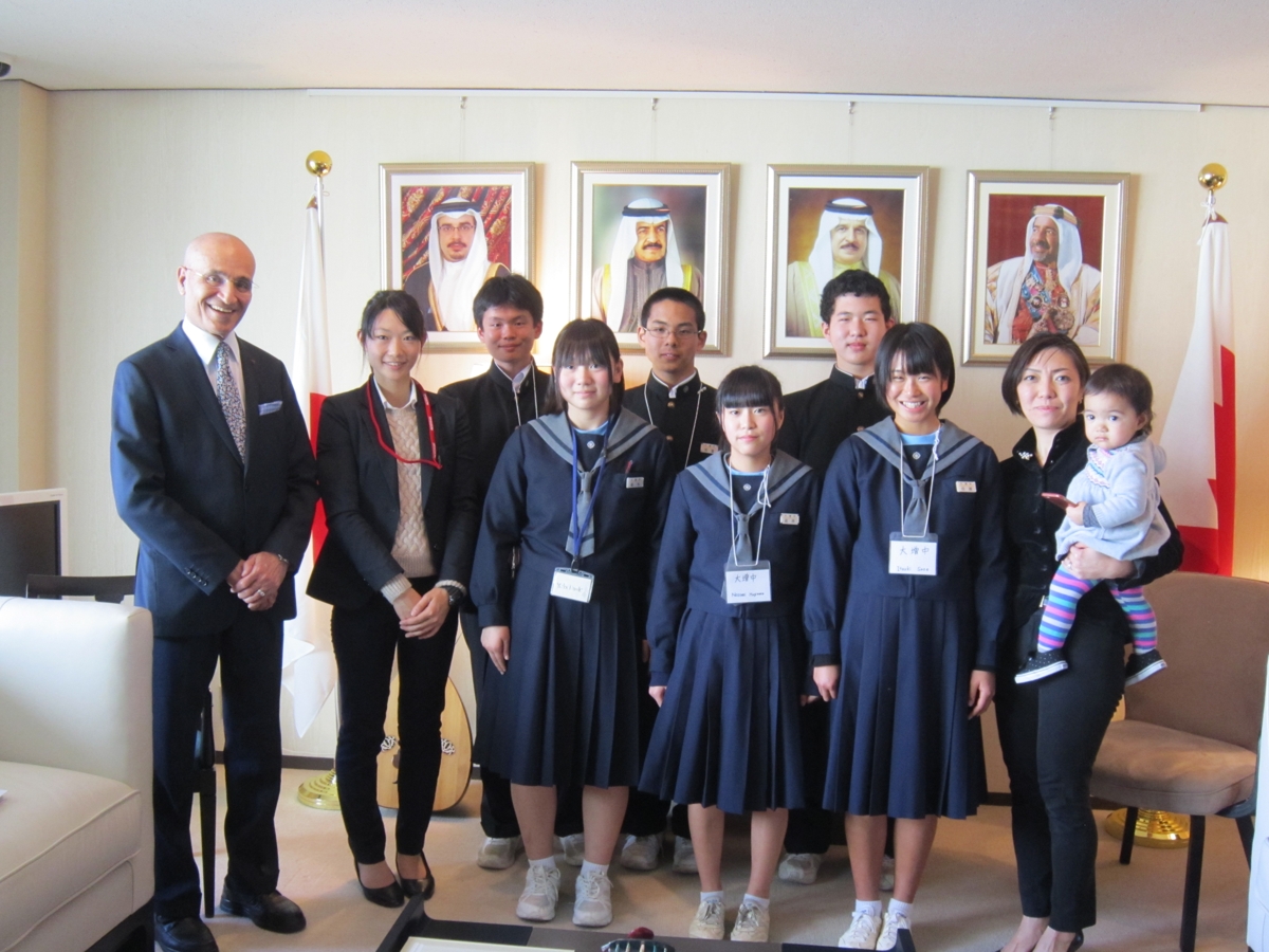 2016年2月9日、埼玉県春日部市立大増中学校2年生による大使館訪問をお受けしました。大使館職員によるバーレーン王国に関するレクチャーののち、ハリール・ハッサン駐日大使同席のもと質疑応答が実施され、バーレーン王国の歴史や文化について理解を深めていただく機会となりました。 〈大増中学校の皆さんと記念撮影〉